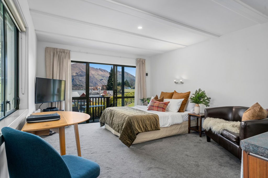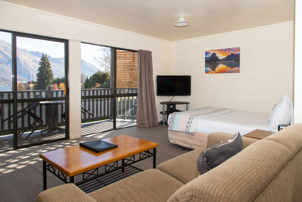 For those desiring more space, our eight one-bedroom apartments can sleep up to four guests and provide the ultimate comfort. Each apartment features an ensuite bathroom, a fully equipped kitchen, and a welcoming lounge and dining area, ideal for unwinding after a day of exploration. These apartments have a mix of mountain and lake views.